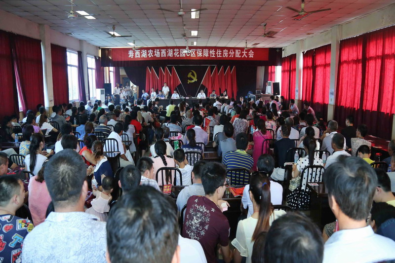 近日,安徽农垦寿西湖农场举行西湖花园C区保障房分配大会,场领导朱为荣、王国福以及相关部门单位负责人出席。西湖花园C区共建设各类保障性住房750套,总建筑面积77197㎡,其中,廉租房334套、居民迁建二期项目201套、危房改造项目215套,分别于2012年10月和2013年5月开工建设,于去年底通过了竣工总验。