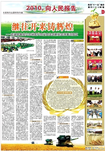 为向全市人民报告“十一五”精彩,翘望“十二五”前景,《蚌埠日报》开辟了《2010,向人民报告》大型系列主题宣传专栏,陆续报道全市各条战线上取得的辉煌业绩。蚌埠龙亢农场现代农业自主创新综合改革试验区成立以来,取得了辉煌的发展成就,得到蚌埠市委市政府高度关注。为充分展示试验区现代农业科技自主创新成果、示范引领全市现代农业建设、进一步推动城乡统筹发展,蚌埠市特邀龙亢农场参加此次系列报道。