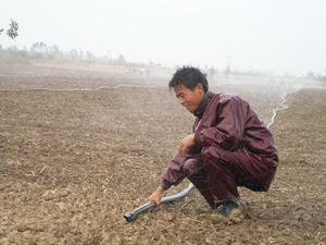 针对秋种以来日益显现的旱情,潘村湖农场广大家 庭农场职工不等不靠,奋力抗旱促苗.图为二分场职 工正在田间采用微孔喷灌技术抗旱促苗.(杨登宏)